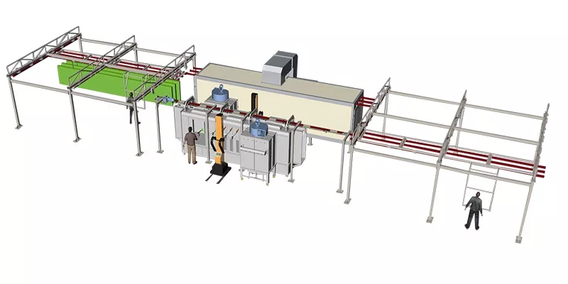 The semi-automatic powder coating line is specially designed for small space factory that requires high volume production of long length workparts, while minimize budget and labor efforts. It is ideal for powder coating aluminum profiles, metal frames, furniture, etc.