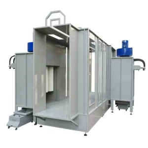 1.This tunnel powder coating booth has 2 working station allows parts recieving coating from both side, parts enter the booth from one entrance and exit from the other through conveyors,